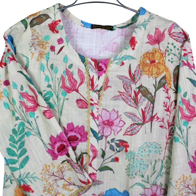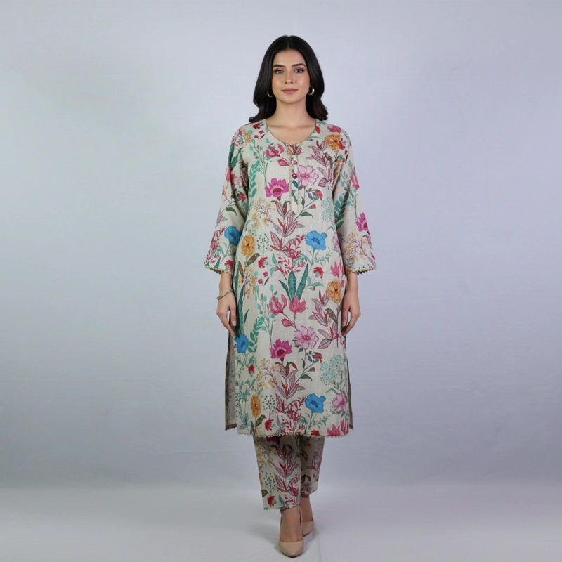 Embrace a fresh, botanical look this season with our Beige Floral Khaddar 2-Piece. This set features a vibrant, multi-colored floral garden print on a neutral beige base. Designed with a contemporary straight-cut shirt and matching straight-fit trousers, it’s the perfect blend of comfort and modern Pakistani style.