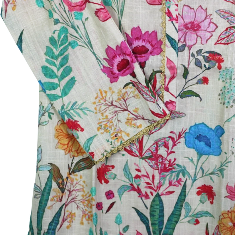 Design Details: The shirt is tailored in a timeless straight silhouette with a slight V-slit neckline and delicate lace detailing on the sleeves and daman. The vibrant pink, blue, and mustard floral motifs pop against the sophisticated beige background. It is paired with matching printed trousers, creating a streamlined, elongated look that is highly popular in current fashion trends.