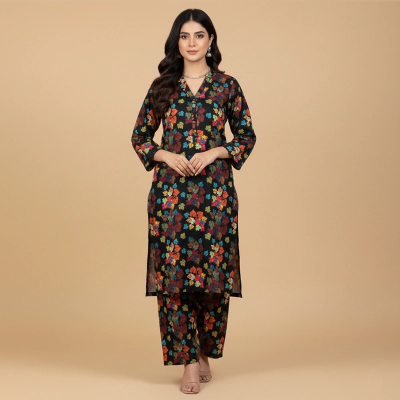 Make a statement this season with our Midnight Flora 2-Piece Khadar Suit. Set against a classic black base, this outfit features a vibrant, multi-colored leaf and floral digital print. Crafted from high-quality, warm winter Khadar, this stitched co-ord set offers a modern silhouette with traditional comfort.