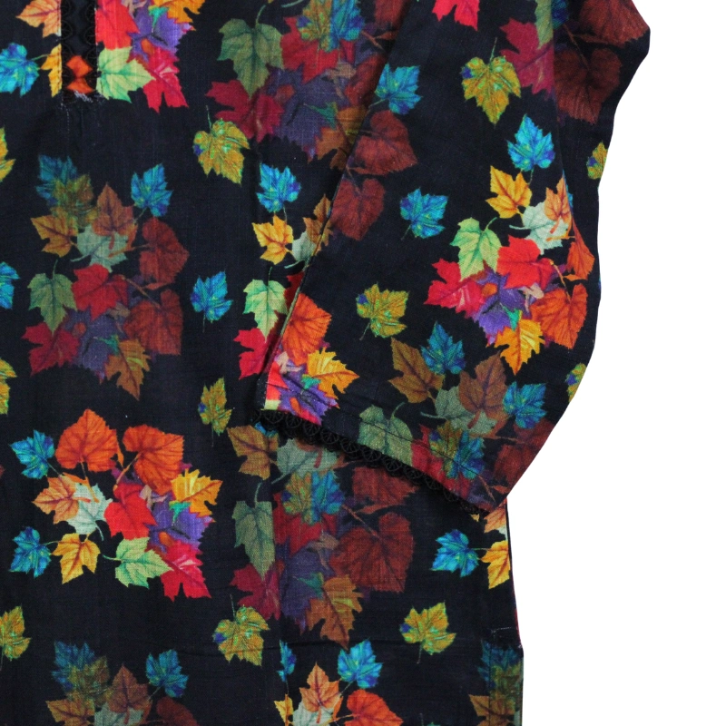 • Striking Visuals: The intricate digital print features a kaleidoscope of autumn leaves and blooms in shades of burnt orange, teal, and gold, all set against a deep black backdrop for maximum impact.