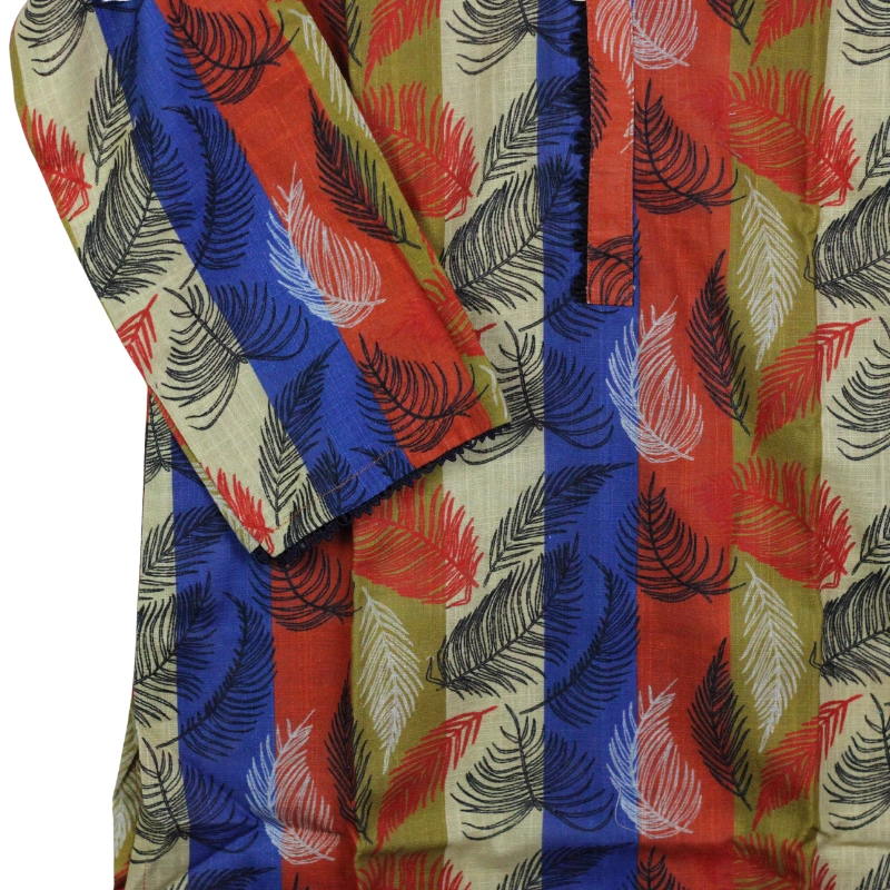 Artistic Digital Print: A unique combination of bold red, deep blue, and earthy green vertical stripes, accented with delicate feather and floral patterns for a slimming silhouette.